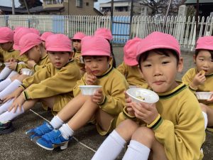 良い秋晴れの中、やきいも会を行いました。登園するとすぐに「今日はやきいも会だね。」と楽しみにする声が飛び交っていました。