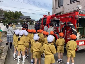 消防団の方にも来ていただき、消防車の見学をしたり、お仕事の内容を聞いたりしました。みんな夢中になって消防車を見ていました。