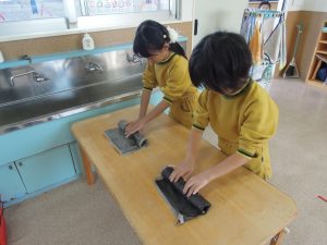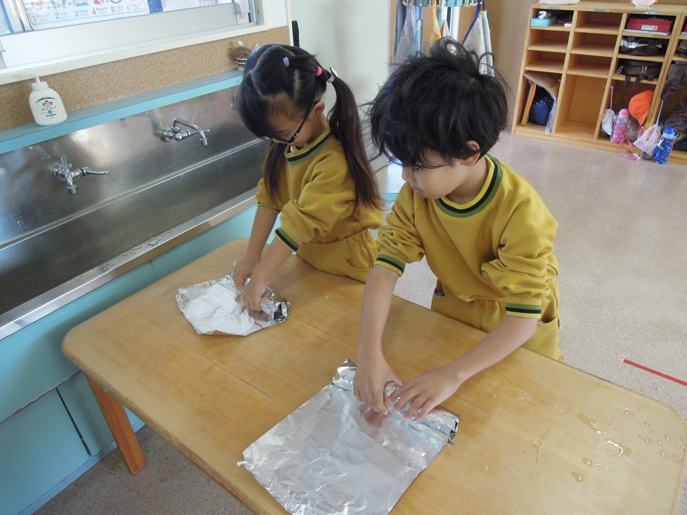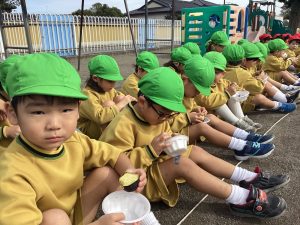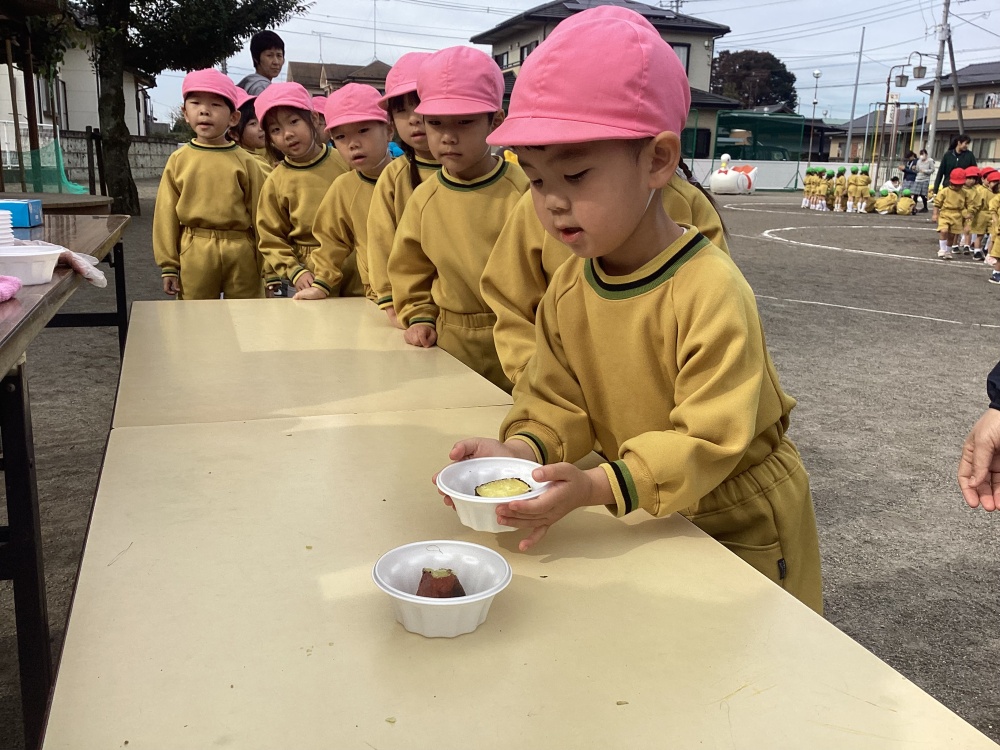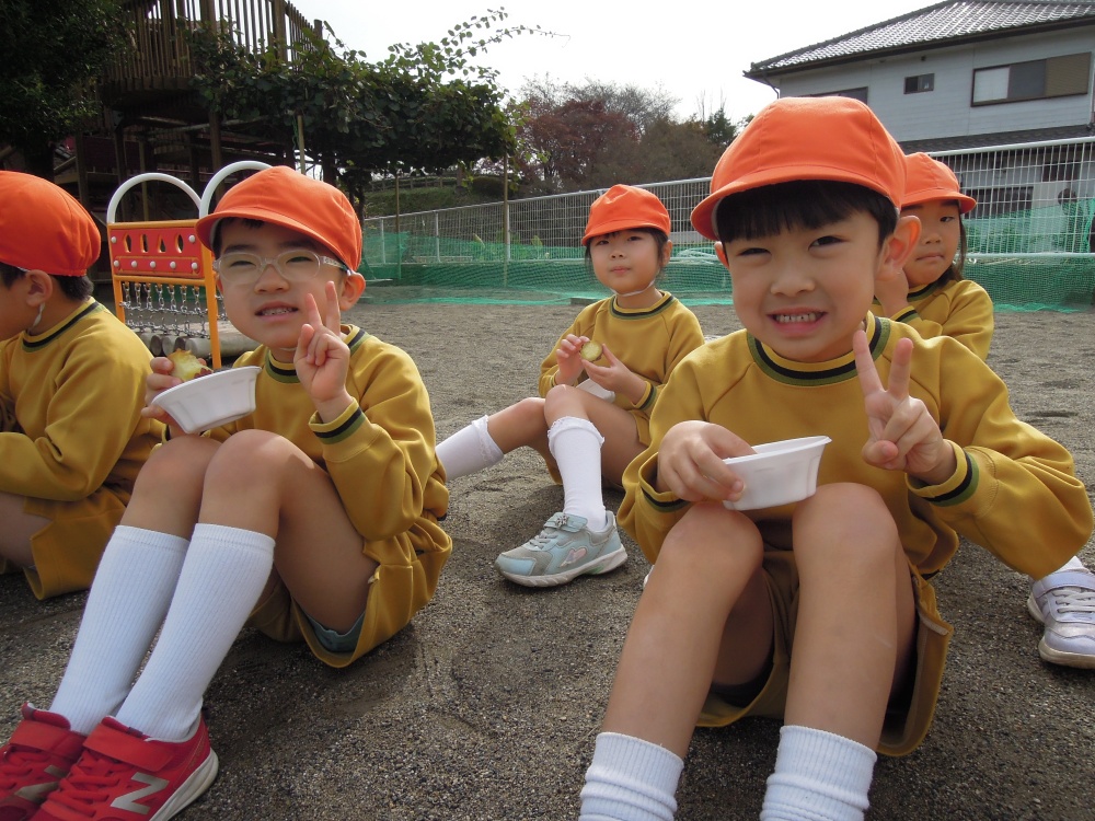 良い秋晴れの中、やきいも会を行いました。登園するとすぐに「今日はやきいも会だね。」と楽しみにする声が飛び交っていました。