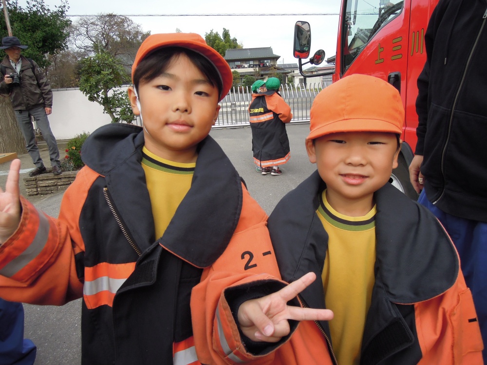 消防団の方にも来ていただき、消防車の見学をしたり、お仕事の内容を聞いたりしました。みんな夢中になって消防車を見ていました。