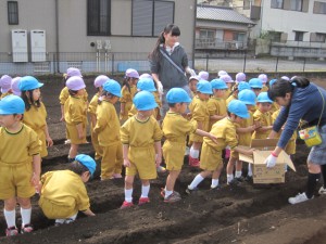 じゃがいも植え☆年中、年少、もも☆ 今日は、年中、年少、もも組でじゃがいも植えに行ってきました! 年中、年少組で準備した種いもをみんなで丁寧に土の上に置きました。 収穫はみんなの学年が一つ大きくなってからになります。楽しみだね♪