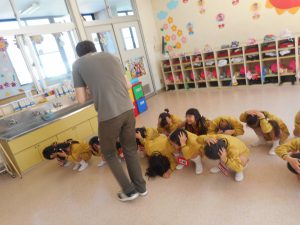 ジェイソン先生の掛け声に合わせて、「パンプキン」や「バット」になりきったり、ゴーストから上手に隠れています。
