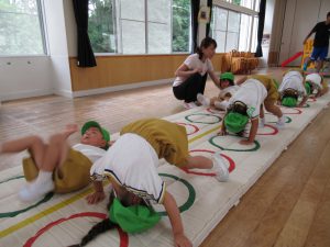体育教室(年少) 今日の体育教室も、前回に引き続き鉄棒を行いました。今回は腕を伸ばして「つばめ」になったり、体を曲げて前回りの練習をしました。 鉄棒の後は、マットで前転をし、平均台を渡り、トンネルをくぐってゴール!講師の先生の話をよく聞き、楽しく参加することができましたね!