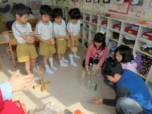 小学生との交流会(年中組) 今日は、上三川小学校の2年生との交流会がありました。 小学生が、折り紙遊びや、お絵描き、ボーリングなど室内で楽しめる遊びをたくさん考えてきてくれました。 子ども達も、目を輝かせながら、興味津々! 外遊びでは、鬼ごっこやへび鬼、ボール遊びなど、小学生にルールを教えてもらいながら、一緒に楽しい時間を過ごすことができました。 年中組の子ども達が1年生になる頃には、2年生は、4年生ですね。 今度は、小学校で会えるのを楽しみにしています。 小学生のお兄さん・お姉さん、ありがとうございました!