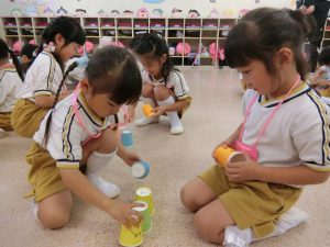 英語教室(年中) 今日は、まずジェイソン先生が吹く笛の音に合わせてお友だちと握手をする遊びを行いました。 笛が鳴ったら握手の手を交換して……笛の合図が段々早くなるにつれて、子どもたちの握手もスピードが上がりとても楽しく行うことができました。 また、2人組や4人組をつくりグループのみんなで協力し、紙コップを積み上げました。みんなで遊ぶことの楽しさを英語教室で知ることができました。 次回もお楽しみに…♪