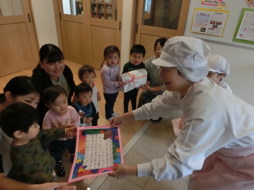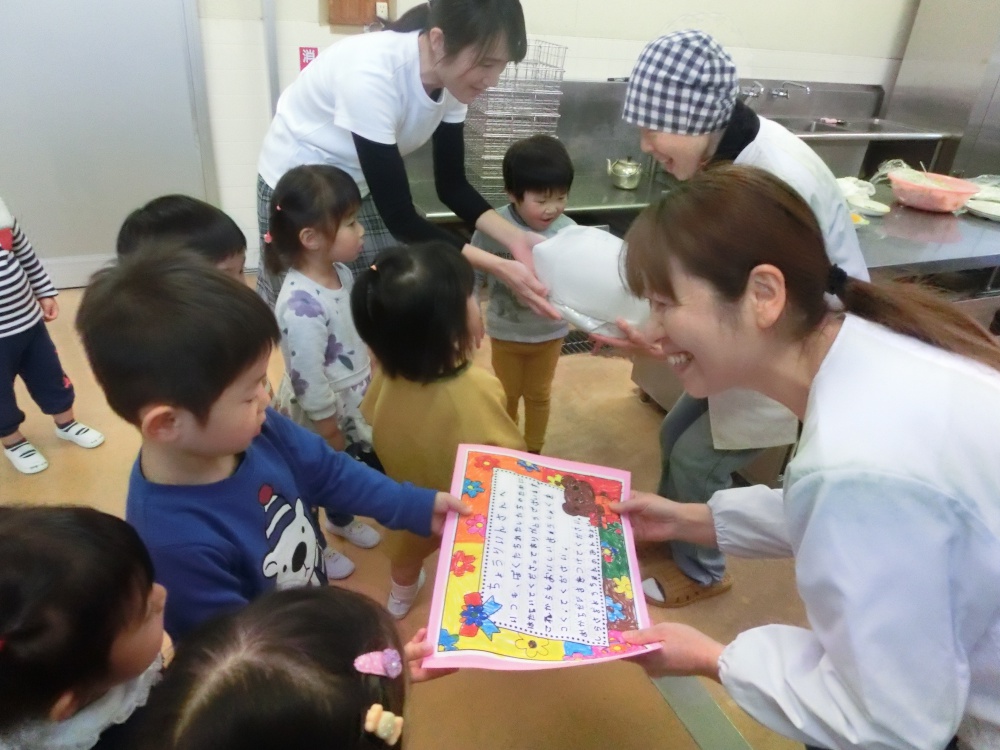 また、毎日、おいしい給食を作ってくれている調理員さんには、ひよこ組、ばら組、たいよう組、もも組さんが届けてくれました。