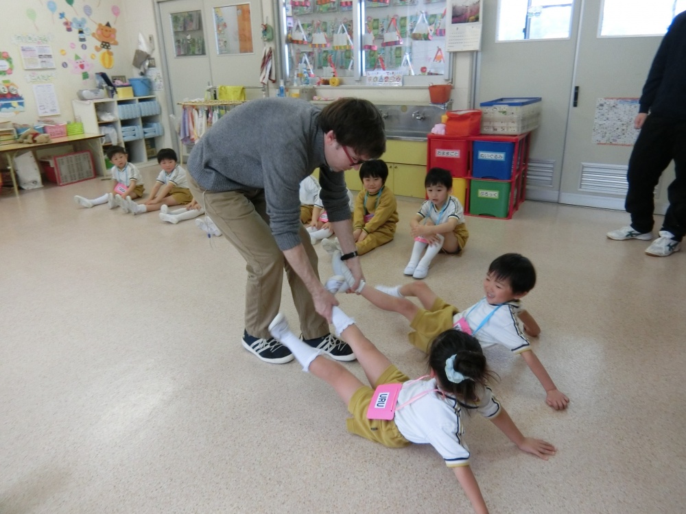 その後、滑り台の階段に見立てて友達の足の間を渡り、最後にジェイソン先生が足を引っ張って床を滑らせてくれました!