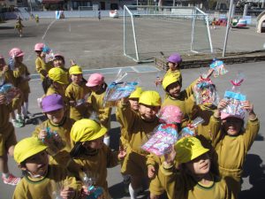 園外活動(年中) 今日はとてもいいお天気の中、城址公園にて クラス対抗電車リレーやしっぽ取りゲームを行いました。 二人一組になり息を合わせて一生懸命走ったり 広い芝生の上で伸び伸びと楽しく活動する姿が見られました。 その後、園長先生からのプレゼントを園庭に隠して、 宝探しゲームを行いました。 まだまだ風邪や感染症が流行していますので、 体調管理に気を付けて元気に来てください☆