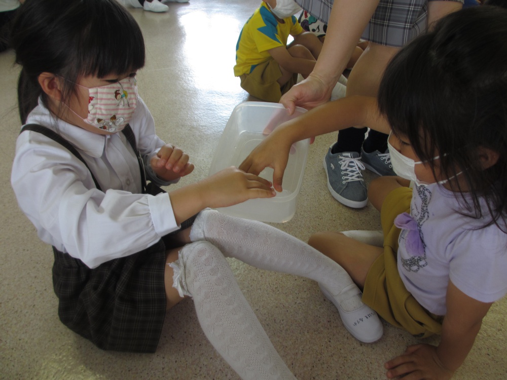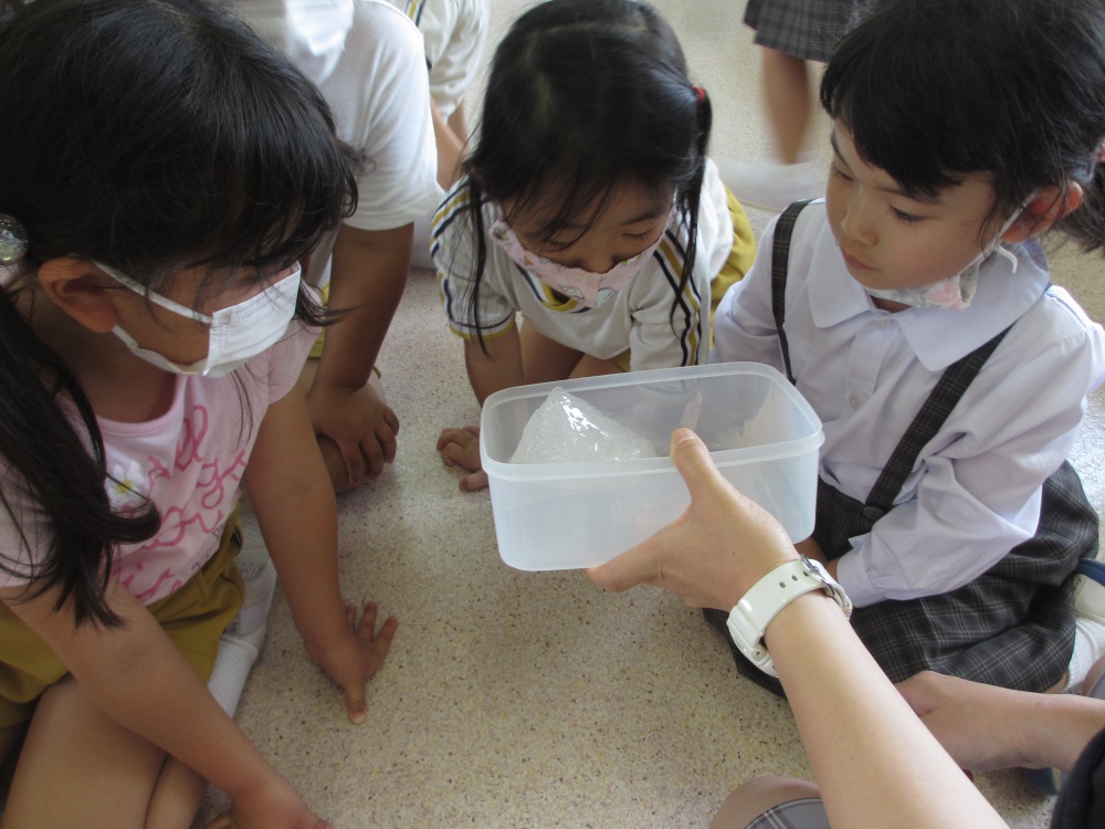 『南極の氷』をいただきました! 保護者の方から、『南極の氷』をいただきました!! こどもたちは、南極!?と、実感がわかないようでしたが、世界地図とともに南極の場所をお話しすると、感心して聞いていました。 そして、氷の登場です!! 南極の氷は空気をたくさん含んでいるため、水で濡らすとぱちぱちと音が聞こえます。 その音を聞いたり、触って氷の感触を楽しみました。 貴重な経験ができましたね。ありがとうございました。