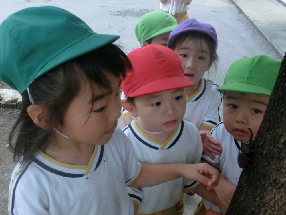 カブトムシ、みーつけた! 今日は、とても過ごしやすい気候で、子ども達は元気に外遊びを楽しんでいました。 お友達に『遊ぼう』と声がする中で、突然、『あ!』と驚く声が響きました。 『何かあったのだろうか?』と駆け寄ると・・・ 園庭の木にカブトムシがいました。 子ども達は、『すごいね』と大喜びでした。 しらさぎ幼稚園のすぐ南側には樹木が茂る城址公園があるので、きっと遊びに来てくれたのでしょうね。 季節はすっかり夏になったんだなと感じる出来事でした。