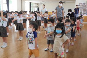 始業式 今日は2学期の始業式を行いました。 みんなで元気よく挨拶をしたあと、「園歌」を歌いました。 そして、園長先生から「2学期について」のお話をしっかりと聞き、たくさんの行事を楽しみにしていました。 2学期に入り、たくさんの行事があります。これからも「手洗い、うがい、マスク着用」を忘れず、感染防止に気をつけて楽しい2学期を過ごせるようにしたいと思います。