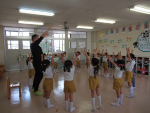 英語教室(年長) 今日から英語教室が始まりました! 講師の先生は、ロバート・ダニエルズ先生『ロブ先生』です! 元気な挨拶と歌で始まり、みんなも体を動かしながら楽しく歌いました。 また、4月生まれのお友達をみんなでお祝いしました。 これからも講師の先生と楽しく英語を学んでいきましょう!
