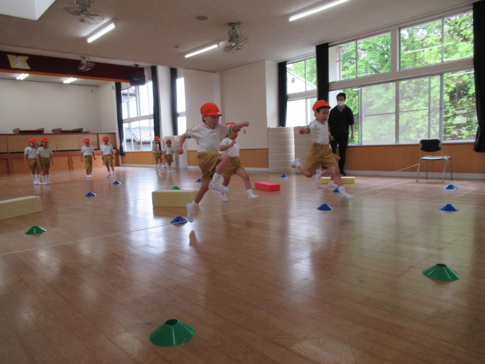 体育教室(年長) 今日から年長組の体育教室が始まりました! 講師の先生は、久保先生です! まずは元気に準備体操をしました☆ その後は、障害物を避けながら様々な走り方をしたり、ひもを使ってのゲームを行い、子ども達もとても楽しく元気に参加することができました☆ 1年間楽しく参加しようね☆