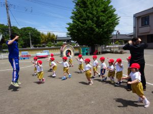 体育教室(年少) 今日は初めて体育教室がありました。 初めは簡単な準備体操からはじまり、四角の中から四角の中にウサギさんやかにさんになって移動したり、 丸や四角、三角などの中に誰が早く入ることができるか競争などをしました。子ども達も動物になりきって楽しく行っていました。次回の体育教室もたのしみですね♪