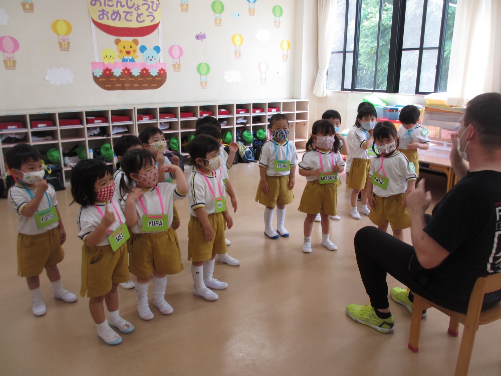 英語教室(年少) 今回の英語教室はハローーソングから始まり、CDの曲に合わせて歌ったり、踊ったりしました。子どもたちも楽しそうに歌を歌いながらリズムに合わせて踊っていました。 次回の英語教室も楽しみですね♪