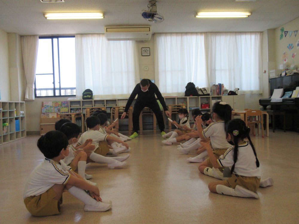 英語教室(年長) 今日は年長組の英語教室が最後となりました。 いつものように日付の確認とハローソングを歌うと、最後にふさわしく『Graduation ゲーム』を行いました。 卒園証書に見立てた紙筒をリレー形式で回して、みんなで力を合わせて取り組みました。 ロブ先生、楽しい時間をありがとうございました。 小学校でも楽しく英語を学んでくださいね!
