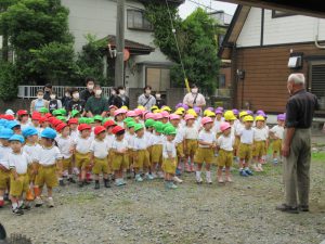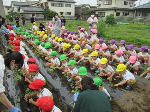 さつまいもの苗植え さつまいもの苗植えに農園まで歩いていきました。 農園の管理をしてくださっている川渕さんから、 苗を縦に植えると大きなさつまいもがなり、横に植えると小さなさつまいもがたくさんなることを 教えていただき、それぞれが自分たちで植えることができました。 収穫は10月頃を予定しています。 どんなさつまいもがなるか、楽しみですね♪