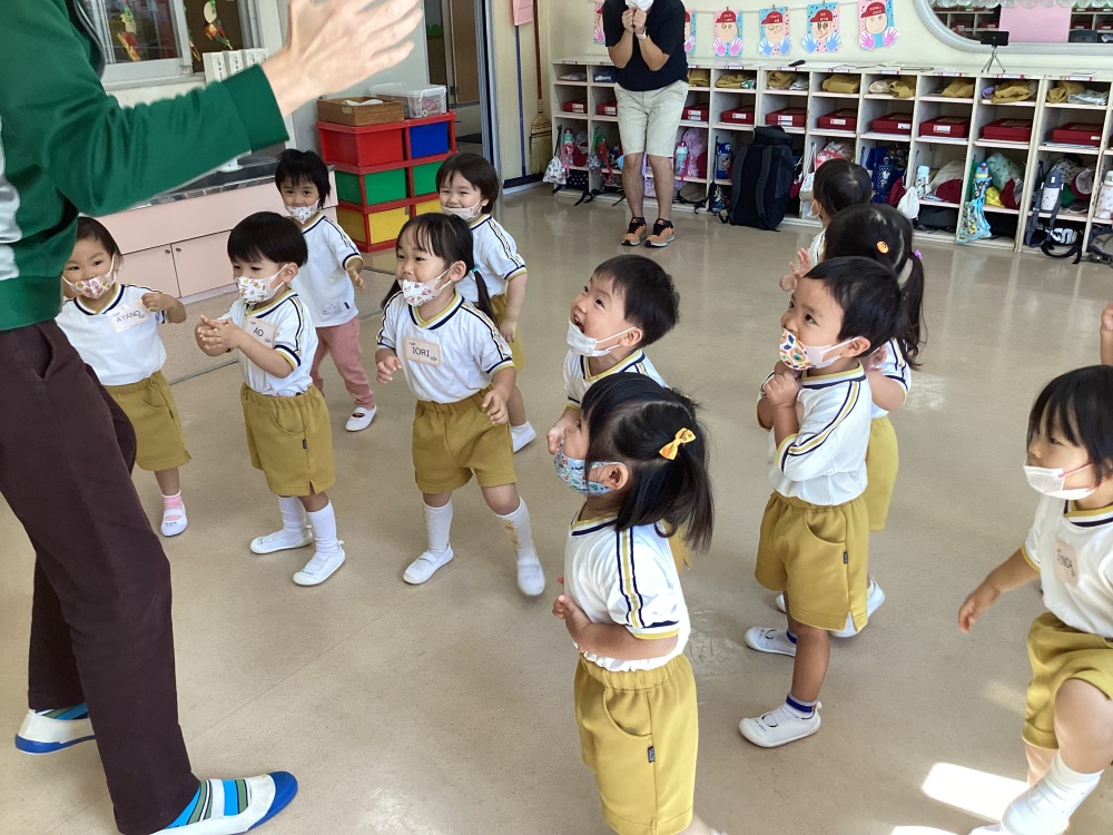英語教室(年少組・もも組) 今日は、英語教室がありました。 もも組は、SMALLから大きくなってBIG、BIG、BIG!! グーチョキパーの英語版「RockScissorsPaper」を行いました♪ 年少組は、1日の流れ「WakeUp、Eat、Brush、Wash、Sleep」をカードを使いながらリズムに合わせて学びました。 子どもたちは、楽しそうに 張りきって発音していました! 次回の英語教室も楽しみですね♪