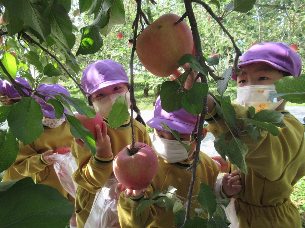 りんご狩り(年中) 大型バスに乗り、りんご狩りへ行って来ました! 今回も菊地りんご園の『きくふじ』というりんごを採らせていただきました。 農家の方から、採り方・選び方を教えていただき、 「どれにしようかな」などと楽しそうに会話をしながら、大きくて赤いりんごを選ぶ様子が見られました☆