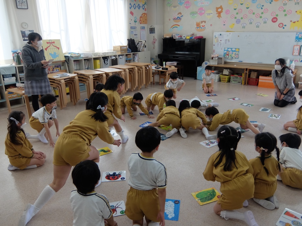 かるた遊び(年長) 以前届いた「はらぺこあおむし」のかるたで早速遊んでみました! 絵本で見たことのある絵がたくさん描いてあり、 子ども達もどんな読み札、絵札があるのか興味津々な姿が見られました。 読まれた平仮名を一生懸命探して、 競争心を持ちつつ、楽しみながら遊ぶ事が出来ました☆ またみんなで一緒に遊びましょうね♪