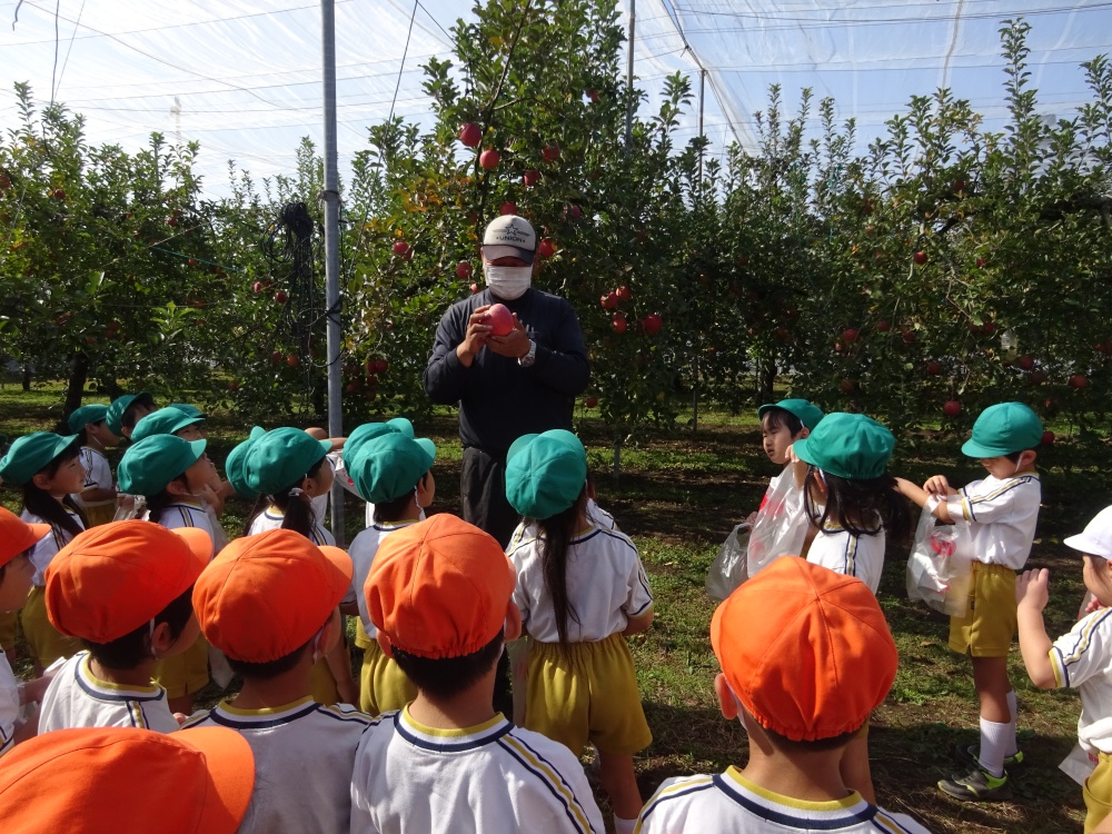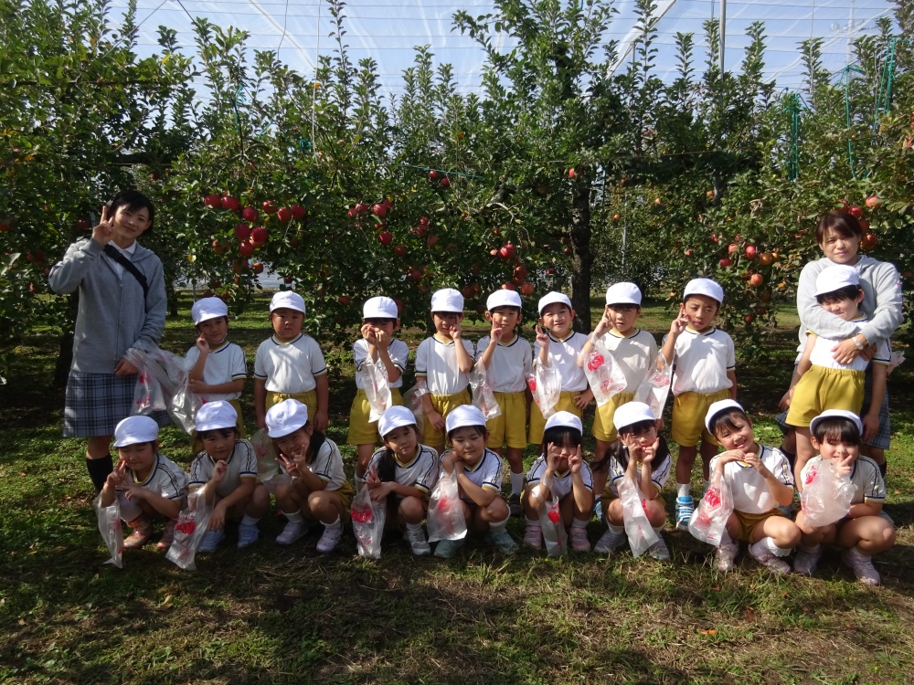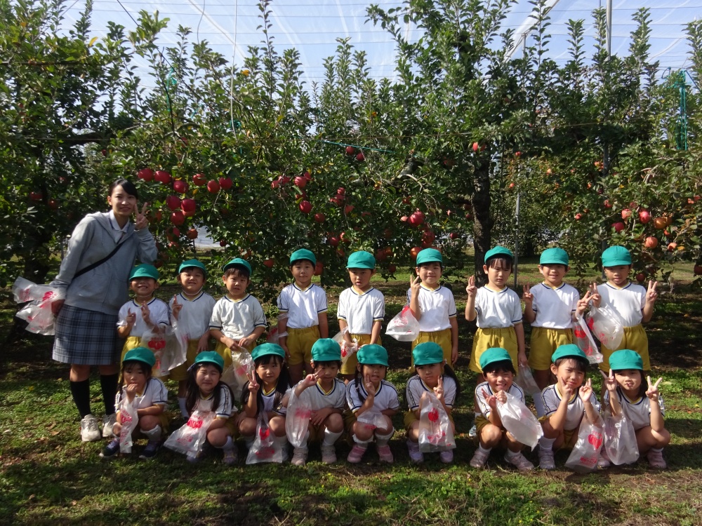 りんご狩り(年長) 今日は、年長組でりんご狩りに出掛けてきました。 りんご園に向かうバスの中では、歌を歌ったり、 りんごに関するクイズをしながら、 楽しく過ごすことができました。 到着後は、りんご園の方に元気にご挨拶をし、 どんなりんごを選んだら良いかや採り方などを 教えてもらい、早速りんご狩りを楽しみました。 赤くて大きなりんごを一生懸命見つける子ども達。 品種は、「きくふじ」です。 ご家庭で、美味しくお召し上がりください。