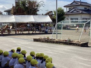 今日はみんなで年長組の鼓笛隊の練習を見学しました。
