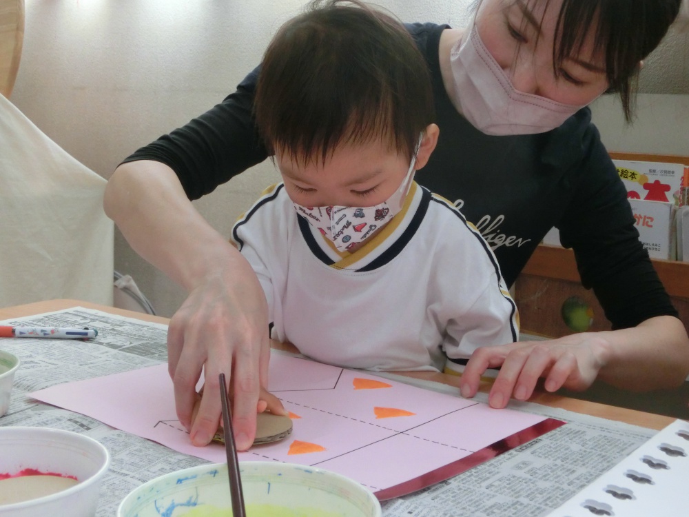 こいのぼり制作(もも組) 暖かく気持ちのよいぽかぽか陽気と共に、新年度がスタートしました。 子ども達は、新しい環境に少しずつ慣れ、笑顔も見られるようになりました。 今日は、『こいのぼり制作』をしました。 スタンプを押したり、筆を使って丸を描いたりしてみんな自由に模様を描くことが出来ました。 これからも色々な制作をしたり、外遊びをするなど楽しく過ごしていきたいと思います。 1年間、よろしくお願い致します。