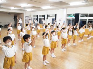 朝礼をしました! 今日はあいにくのお天気となってしまいましたが、室内で朝礼を行いました☆ きちんと前ならえをしたり、みんなで「サンサン体操」をしました。 暑さに負けずに元気いっぱい体操することができました。 2学期も思い切り体を動かして体操しましょうね!