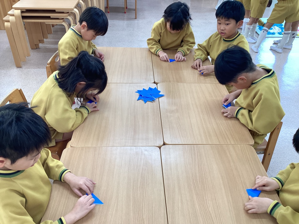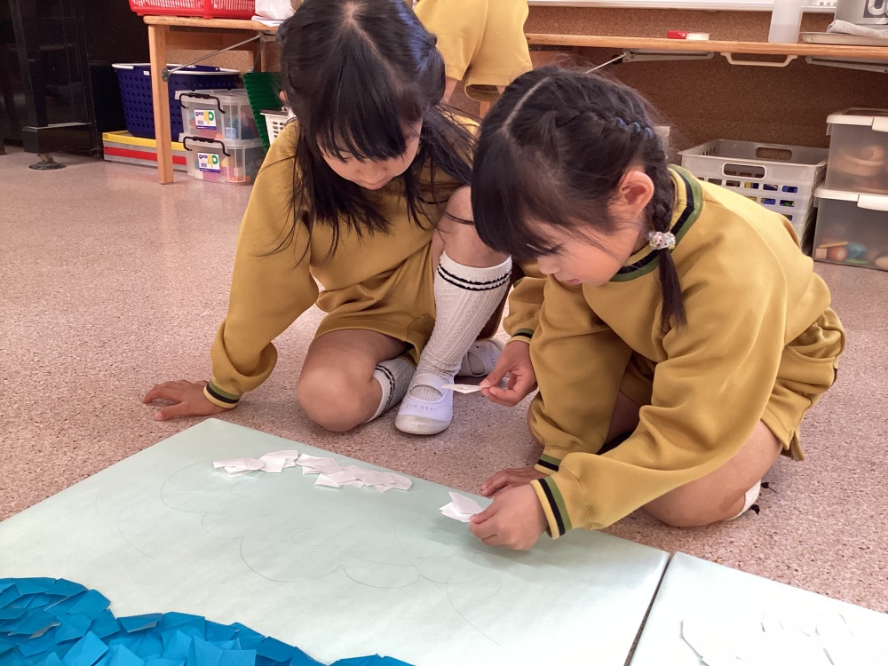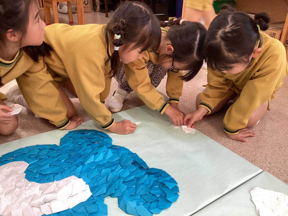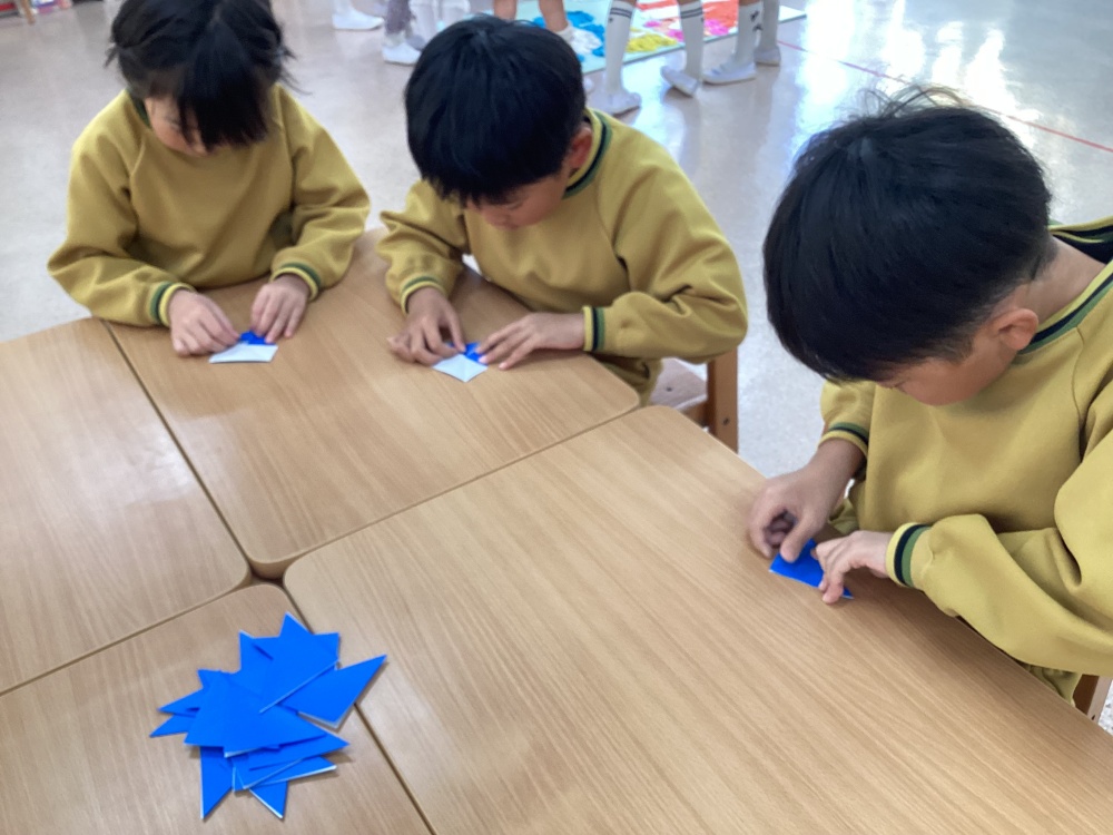 折り紙で共同制作(冬) 寒さも日に日に増して来ましたね。 恒例となりました「ORIGAMI」の制作を園みんなで行いました。年長さんのお友達には小さな折り紙で細かい部分を折ってもらいました。とても真剣に沢山折ってくれました。 一つひとつ丁寧に貼ってくれています。とてもかわいい作品になりましたので完成した作品をお楽しみに♪♪ これからも、ますます寒さが厳しくなってきますが風邪などひかずに乗り切っていきましょう。
