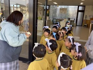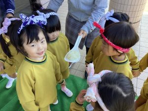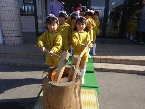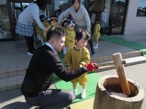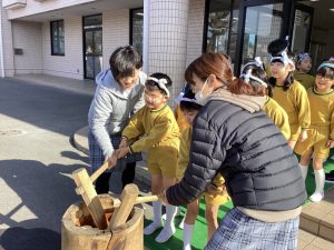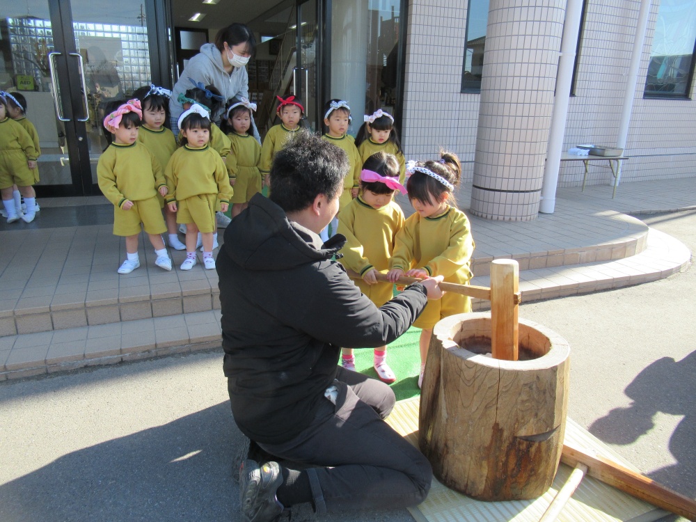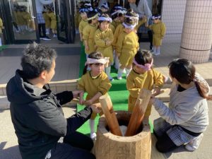 おもちつき 寒さも少しずつ厳しくなり、本格的な冬の訪れを感じられる頃となりました。 今日は、おもちつきを行いました。 もち米をお釜で蒸して、それをついてお餅にしました。 保育者がおもちをつく前にもち米からおもちが出来ていることを伝えると子どもたちは「すごいね!」「そうなんだ!」とリアクションしながらお話を聞く姿が見られました。 次は子どもたちの番になると保育者ときねを持って「ぺったん、ぺったん」とおもちつきを楽しむ姿がみられました。 みんなが一生懸命ついたお餅は、鏡餅にして玄関に飾らせていただきます。