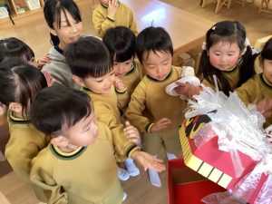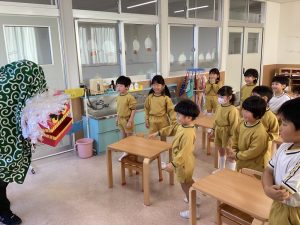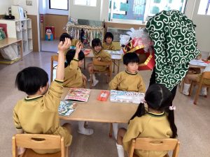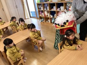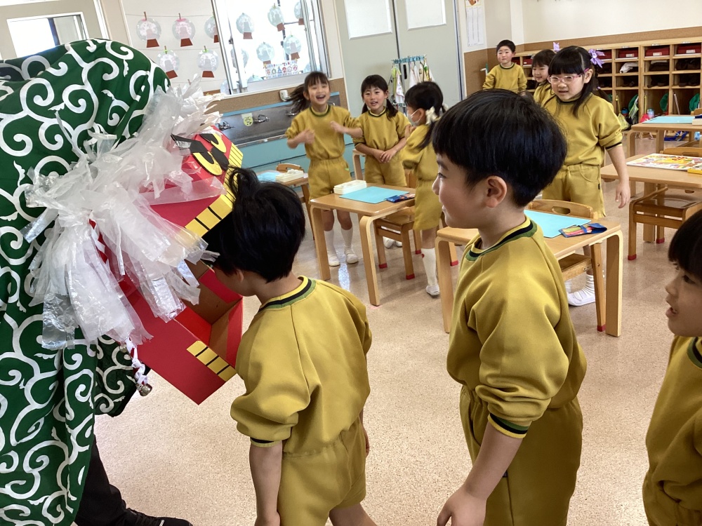 今年も獅子舞が来てくれました! 今年も幼稚園に獅子舞がやってきました! 獅子舞がやってくるとびっくりして泣いてしまう子や近くに来て優しく触る子など様々な姿が見られました。獅子舞は何をしてくれるかなどの話も真剣に聞いてくれていました。 獅子舞が人の頭を噛むことには「その人についた邪気を食べる」という理由があり、病気や悪い子にならないようにとの意味が込められていて、縁起が良いとされています。 今年も皆様が元気に過ごせますように。