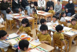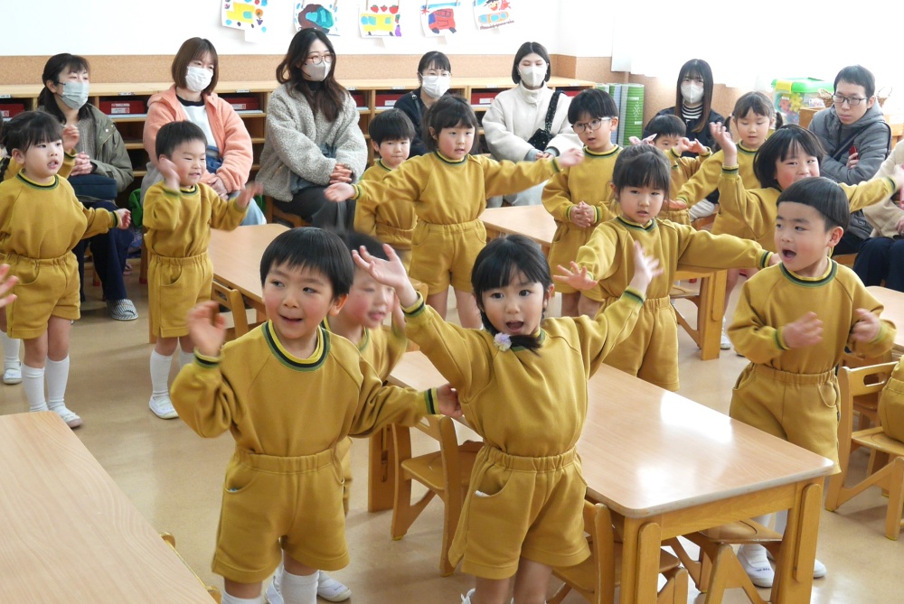 保育参観(年少組) 今日は、年少組の保育参観を行いました。 まず初めに、保護者の方には参観前に 講話「子どもの豊かな心を育むヒント」を聞いて頂きました。 今回は、切り紙制作を行い、クレヨンで描いて貼る工程を見ていただきました。 普段と異なる雰囲気に緊張した様子の子ども達でしたが、 最後まで一生懸命取り組むことができました。 保護者の皆様に作品を見て頂き、嬉しそうな姿が見られました。 本日は、お忙しい中ご参加いただきありがとうございました。
