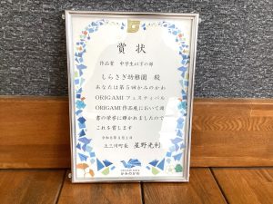 かみのかわORIGAMIフェスティバル 早いもので今年度も残りわずかとなりました。子ども達はお友達や保育者と遊んだり、うたったりしながら楽しい思い出作りをしています♪ さて、先日「かみのかわORIGAMIフェスティバル」に出展した作品が、皆様の投票により作品賞1位を受賞しました!! 子ども達も大喜びです!!たくさんの投票をありがとうございました。これからも子ども達が折り紙に触れる機会を作っていきたいと思います。 作品は幼稚園の玄関に飾ってありますので、お時間のある時にぜひご覧ください♪
