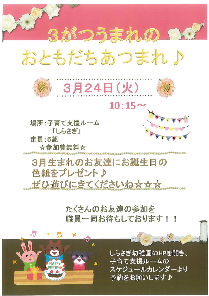【子育て支援ルーム親子活動】~3がつうまれのおともだちあつまれ♪~参加者募集!