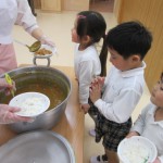 調理士さんが直接クラスまで大きなお鍋を運んできてくれます♪