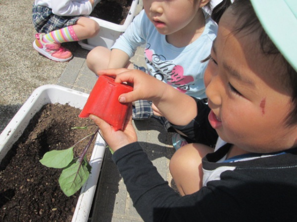 植物たちも元気に芽ぶき、ひまわり組はミニトマトの苗を各々の鉢に植え、