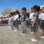 地震発生の時の訓練で、みんな先生の指示を良く聞いて