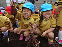 いちご狩り、りんご狩りといった園外保育だけでなく、通常保育の中でも園外保育を行っています。スクールバスに乗ってしらさぎ公園、蓼沼親水公園など町内の公園や近隣の町の公園や施設にも出掛けています。毎回、子供たちは遠足気分で大喜びです。また、園に隣接する城址公園はまるで自分たちの庭のようです。4月は桜の花の下でお散歩をしたり、四季の訪れを身近に感じ、自然を満喫しています。その他、しらさぎ幼稚園ならではの農園活動として、ジャガイモやサツマイモの栽培をしています。苗を植えることから始まり収穫を楽しみます。収穫したジャガイモは給食メニューの中で使用し、サツマイモは園庭でやきいも会を行い、収穫を喜び秋の味覚をみんなで楽しみます。